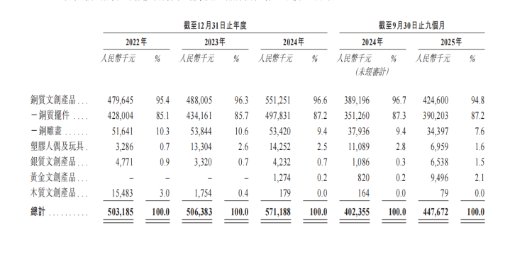 招股书表示,铜师父超90%的收入依赖于铜质文创居品。2022年至2024年及2025年前三季度,公司铜质文创居品的收入区别为4.8亿元、4.88亿元、5.51亿元、4.25亿元,区别占同期总收入的95.4%、96.3%、96.6%及94.8%。新京报记者在铜师父线上的旗舰店详实到,“遮拦摆件”热销前三名区别是“好运铜葫芦”“吉利苹果”“真金鎏镀实心铜元宝”,均为铜摆件。