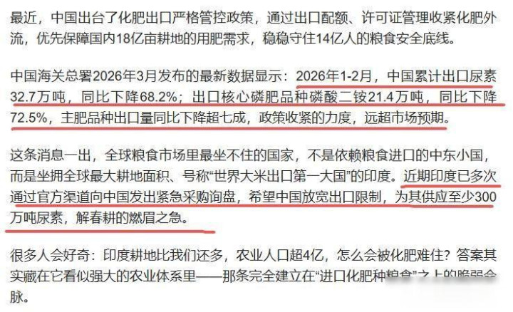 提及来真有深嗜,印度老说我方是宇宙粮仓,耕地比中国还多,可自家化肥厂产能跟不上,只可靠入口,专家动力一乱,中东的货运不来,印度这边就急了,客岁春耕前囤了八百万吨尿素,本年库存剩不到三分之一,地里庄稼眼看就要撑不住了。