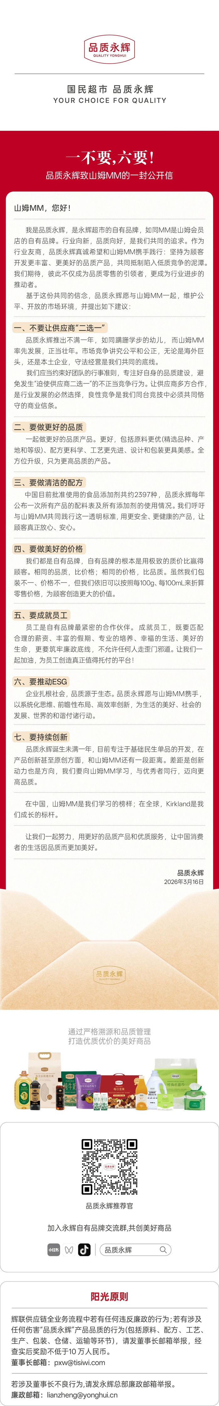 东谈主民财讯3月16日电,3月16日,永辉超市自有品牌“品性永辉”发布致山姆MM的一封公开信,信中敕令山姆旗下自有品牌MM不要让供应商“二选一”,滚球app刚烈反对不梗直竞争活动,杏彩(XingCai)官网平台应当敛迹好团队的行事准则,专注好自己的品性开辟,让供应商多方协作,信守良性竞争。