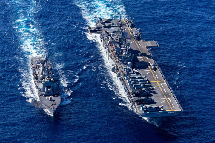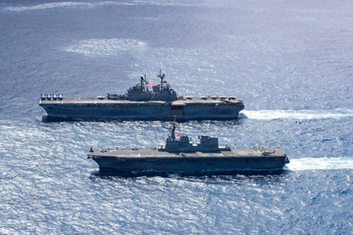 在这场演习里,好意思军军舰和日本海自的“伊势”号直升机结果舰、“大隅”号登陆舰并肩飞行,玩了一出两栖作战的戏码。