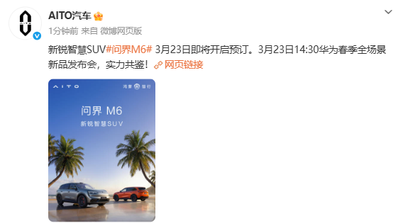 [CNMO科技音尘]3月16日,问界汽车官方晓喻,全新中型SUV问界M6将于3月23日进张开启预定。跟着预定日历的公布,这款此前已在工信部完成申报的车型,其中枢成就和商场定位也逐渐明晰。