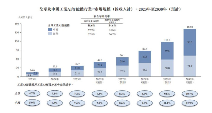 凭据灼识商议的数据,中国工业AI智能体行业的市集领域已达148亿元,瞻望到2030年将达906亿元,2025年至2030年复合年增长率为43.6%。