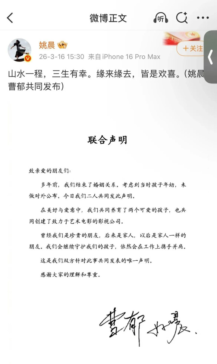 “山水一程,三生有幸,缘来缘去,齐是抖擞,”短短几行字,就综合了姚晨的第二段婚配,谁也没念念到他们他们确切也曾离异多年,仅仅为了孩子一直莫得对外界公布!