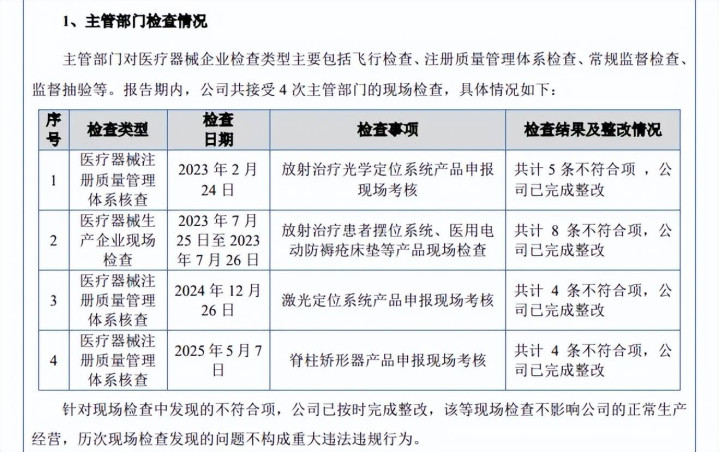 四次现场查抄均存在不相宜项,未经审查发布医疗器械告白。2022年至2025年1-6月(评释期内),科莱瑞迪共接管4次运用部门的现场查抄,均存在辨认规行径,2023年2月,发射诊治光学定位系统产物文书现场考察发现5条不相宜项;2023年7月25日至2023年7月26日,发射诊治患者摆位系统、医用电动防褥疮床垫等产物现场查抄发现8条不相宜项;2024年12月,激光定位系统产物文书现场考察发现4条不相宜项;2025年5月,脊柱矫形器产物文书现场考察发现4条不相宜项,现在干系不相宜项已完成整改。