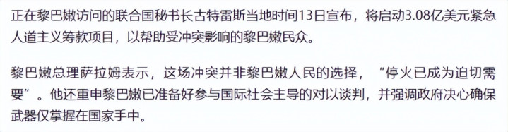 再加上两边中枢诉求差距很大,黎巴嫩政府条目以色列先寝兵,撤出争议地区,以色列则条目真主党淹没武装,撤到利塔尼河以北,这齐是两边无法经受的底线。