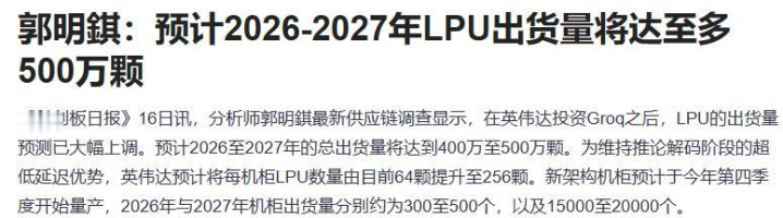 分析师郭明錤最新供应链拜谒判辨,在英伟达投资Groq之后,LPU的出货量预测已大幅上调。预测2026至2027年的总出货量将达到400万至500万颗。为看护施行解码阶段的超低延长上风,英伟达预测将每机柜LPU数目由咫尺64颗晋升至256颗。新架构机柜预测于本年第四季度运行量产,2026年与2027年机柜出货量别离约为300至500个,以及15000至20000个。受该音书刺激,午盘pcb板块走强。