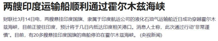 两艘吊挂印度国旗、附庸于印度航运公司的液化石油命运输船近日得胜穿越霍尔木兹海峡,咫尺正驶往印度,预测将于几日内抵达印度关系口岸。