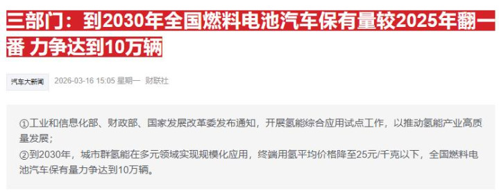 据报谈,工业和信息化部、财政部、国度发展考订委发布对于开展氢能详细诳骗试点使命的见知。其中指出,到2030年,城市群氢能在多元规模竣事范围化诳骗,末端用氢平均价钱降至25元/千克以下,力求在部分上风地区降至15元/千克傍边;宇宙燃料电板汽车保有量较2025年翻一番,力求达到10万辆。