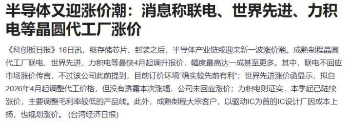 继存储芯片、封装之后,半导体产业链或迎来新一波加价潮。锻真金不怕火制程晶圆代工场联电、世界先进、力积电等最快4月起调升报价,幅度最高达一成致使更多。