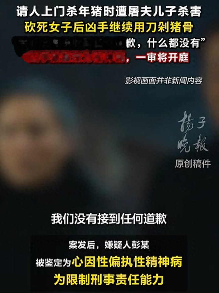 2025年1月,湖北别称六旬女子在过年前请屠户上门杀年猪时,却惨遭屠户带来维护的犬子杀害。案发后,嫌疑东谈主彭某被浮松为心因性过头性神经病,为执法贬责智商。3月27日,被害东谈主犬子黄先生告诉扬子晚报/紫牛新闻记者,该案一审将于4月1日在南漳县东谈主民法院开庭审理。