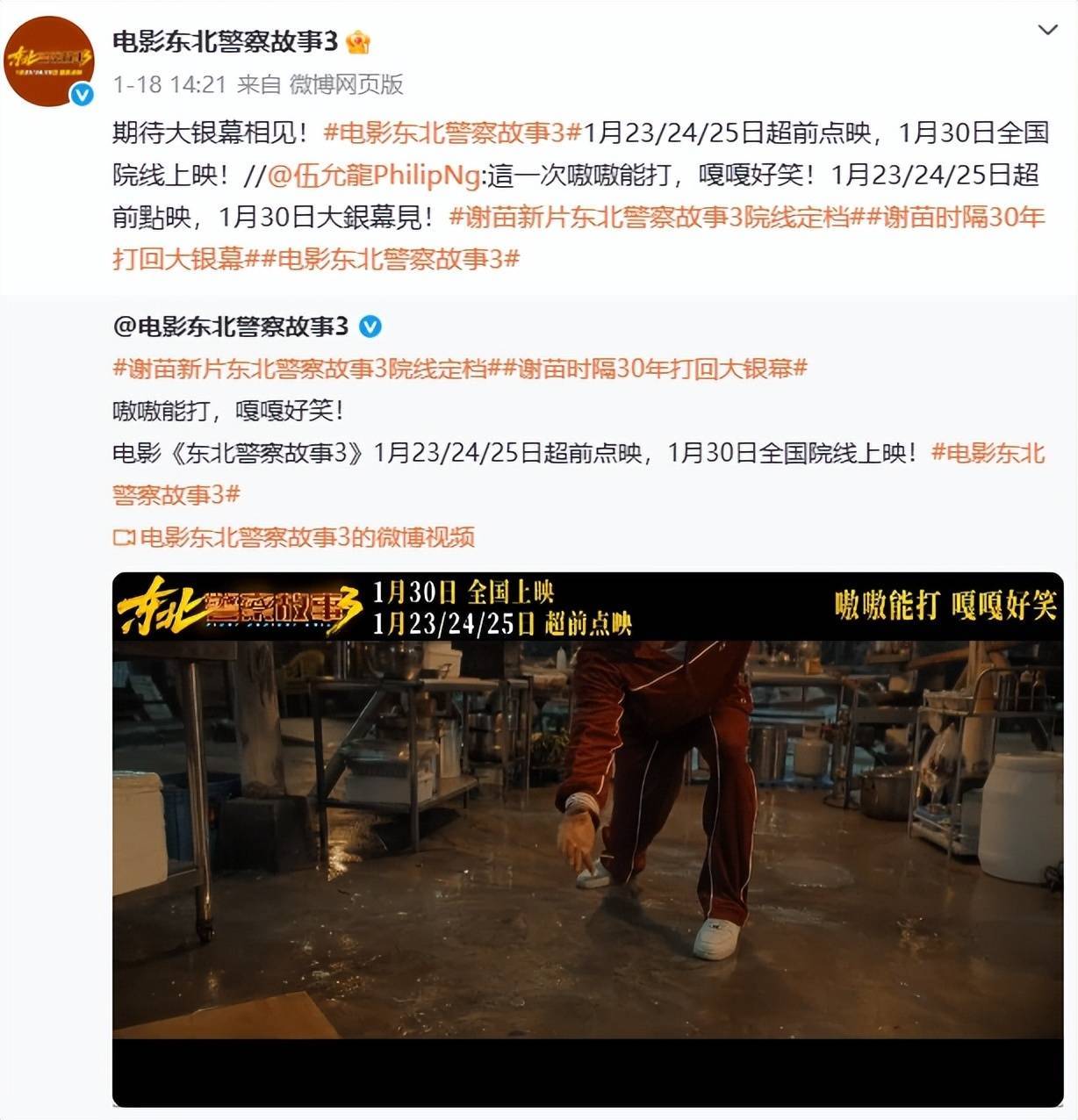 从预报中看,第三部依然赓续了前两部的硬核动作与东北笑剧的混搭格调。