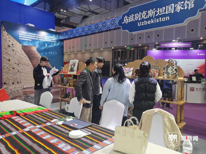相同,在“买在金砖”展区,乌兹别克斯坦展台东谈主头攒动,有东谈主被缜密的挂毯、羊毛帽诱导,也有东谈主来寻商机、谈配合。